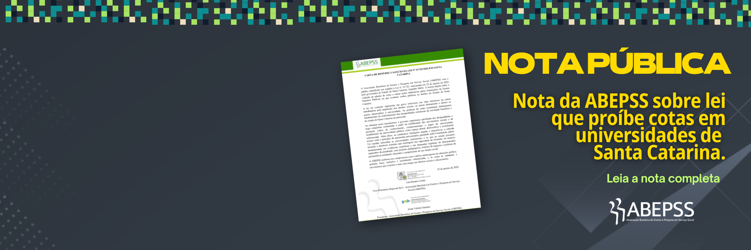 A Associação Brasileira de Ensino e Pesquisa em Serviço Social (ABEPSS) é uma entidade Acadêmico Científica que coordena e articula o projeto de formação em serviço social no âmbito da graduação e pós-graduação.