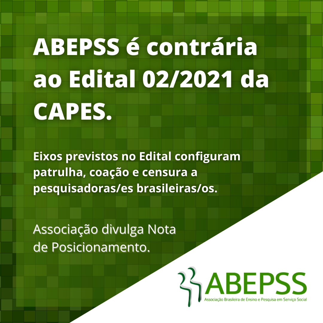A ABEPSS se posicionou de forma contrária e repudiando o Edital 02/2021 “Família e Políticas Públicas no Brasil”, inserido no âmbito do Termo de Cooperação estabelecido entre a Coordenação de Aperfeiçoamento de Pessoal de Nível Superior (CAPES) e a Secretaria Nacional da Família, do Ministério da Mulher, da Família e dos Direitos Humanos (SNF/MMFDH). O posicionamento, veemente, foi registrado em nota divulgada nesta sexta-feira, 22.